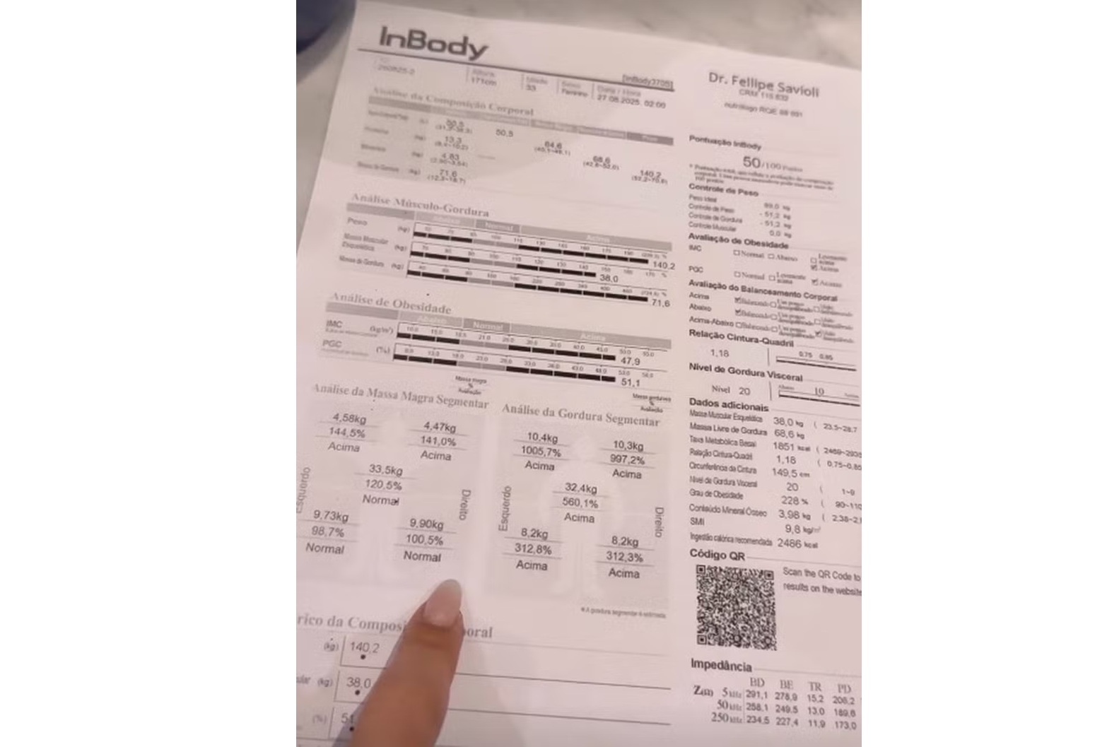 No exame mais recente, ela aparece com 140,2 kg, sendo 71,6 kg de massa magra e 38 kg de gordura, e reforçou que o resultado não é milagre, mas consequência de disciplina e cuidado contínuo; ao todo, a influenciadora já perdeu 81 quilos desde a cirurgia.