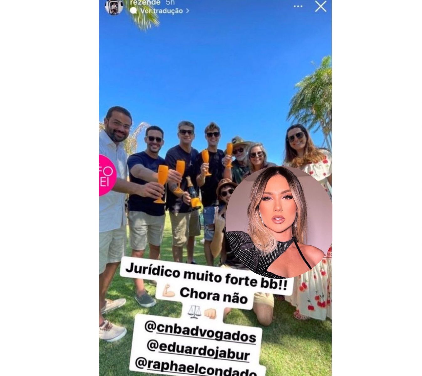 No entanto, Rezende não pareceu muito ligar para esta parte do acordo e comemorou nas redes sociais, sem citar o nome da ex, mas com muito deboche: "Jurídico muito forte, bebê. Chora não", escreveu ele ao postar com os advogados e uma garrafa de champagne.