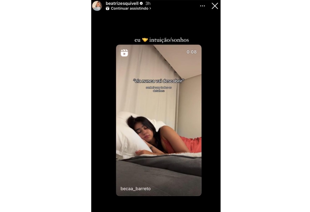 Beatriz Esquivell compartilhou um vídeo de Beca Barreto sobre traição e indicou que teve uma intuição sobre o tema. "Eu [emoji de mãos dadas] intuição/sonhos".