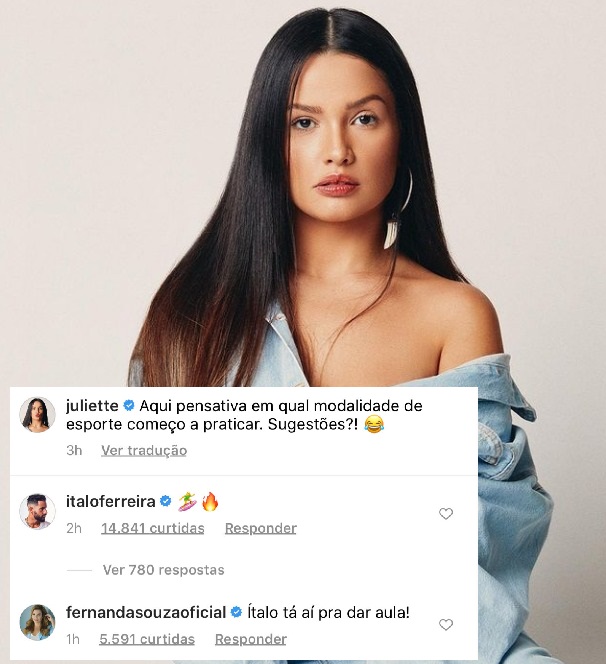 A ex-BBB Amanda Djehdian entendeu a dúvida da sister e brincou: “Eu se fosse vc fazia revezamento. Revezamento de modalidades, ai depois escolhia qual gostou mais”, escreveu. Fernanda Souza foi mais direta: “Ítalo tá aí pra dar aula!.". Maysa parece fazer parte dos seguidores que “shippam” Juliette com Ítalo: “surf né”, escreveu a apresentadora.