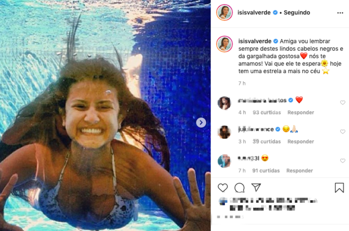 “Amiga vou lembrar sempre destes lindos cabelos negros e da gargalhada gostosa. Nós te amamos! Vai que ele te espera. Hoje tem uma estrela a mais no céu”, escreveu ela com a foto da amiga se divertindo em uma piscina.