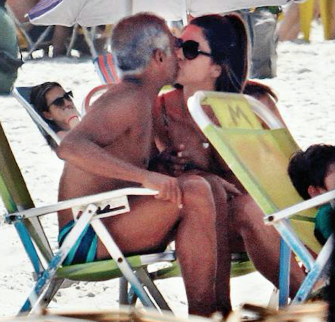 Romário foi clicado aos beijos com uma morena misteriosa, na Praia da Barra, zona Oeste do Rio de Janeiro. O senador estava também na companhia de amigos jogando futevôlei.
