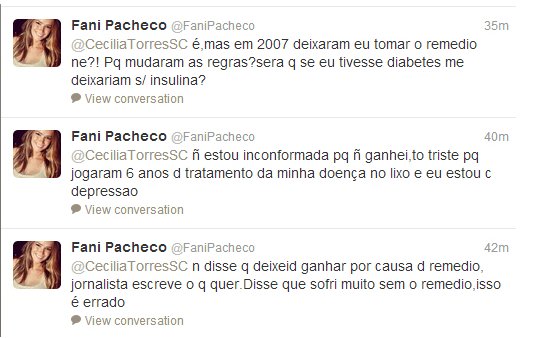 Um internautas comentou a publicação e disse que o risco foi assumido por ela. E Fani respondeu: " É, mas em 2007 deixaram eu tomar o remédio, não é?! Por que mudaram as regras? Será que se eu tivesse diabetes me deixariam sem insulina? ".