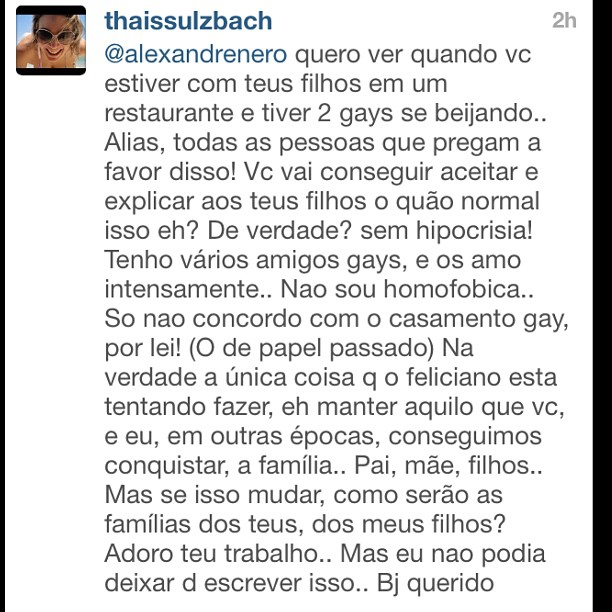 "Oi @thaissulzbach gostaria de dar a MINHA opinião, já que foi numa postagem MINHA, que vc deu a SUA.