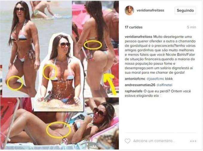 "Muito deselegante uma pessoa querer ofender a outra a chamando de gorda!qual é o preconceito? Tenho várias amigas gordinhas que são muito melhores e menos fúteis que você Nicole Bahls!", disse Veridiana.