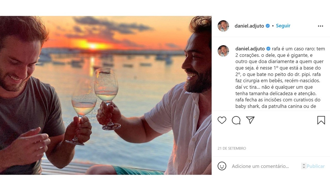Daniel Adjuto falou pela primeira vez publicamente sobre a sexualidade, ao anunciar que namora com o médico Rafael Rocha.