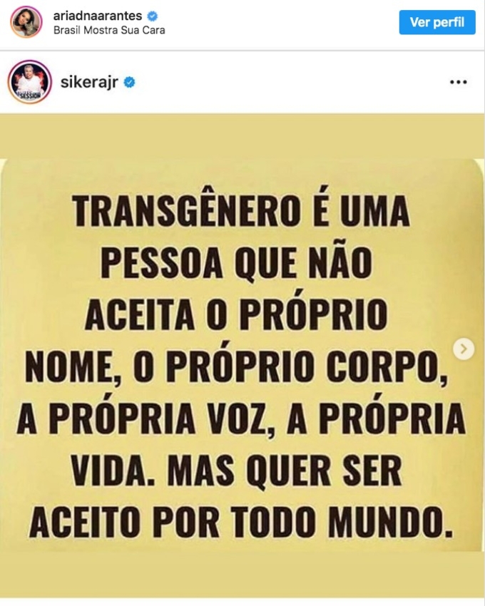 Ariadna, que é trans, detonou Sikêra em uma publicação no Instagram nesta quinta-feira (24). “Carta Aberta ao comunicador Sikêra Jr. Você como comunicador deveria estudar um pouco mais pra falar sobre esse assunto. Me dá vergonha que em 2020 tenha gente como você que tem o espaço que tem e no entanto compartilham ignorância. Transgêneros não se IDENTIFICAM. Se nós não nos aceitássemos, todos nós estaríamos mortos. Alguns pulando de um prédio. Se jogando na frente de um trem. Cortando os pulsos. E isso realmente acontece sabe porque? Porque existe pessoas como você que não sabe o significado da palavra RESPEITO. É vergonhoso que em pleno século 21 um comunicador incentive ao ódio com essa desinformação”, detonou.