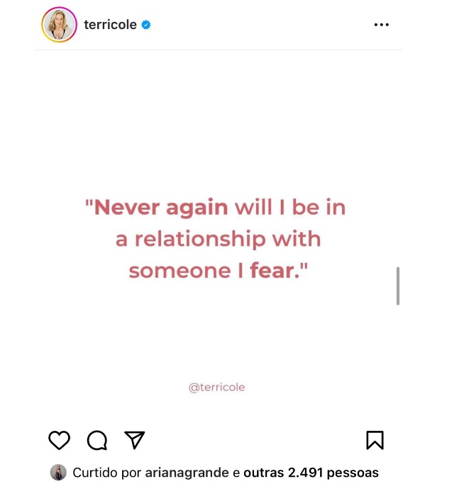 "Nunca mais terei um relacionamento com alguém que eu temo", dizia a publicação de janeiro da psicoterapeuta Terri Cole, curtida por Ariana Grande.