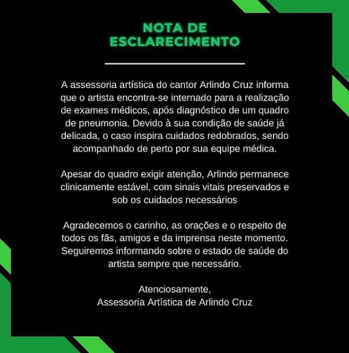 O cantor Arlindo Cruz voltou a ser internado no Rio de Janeiro. Segundo a colunista Fábia Oliveira, do Metrópoles, o sambista está no CTI do hospital Barra D’Or, na zona oeste da capital, após ser diagnosticado com derrame pleural — acúmulo de líquido entre os pulmões e a parede do tórax, que pode causar dor no peito, tosse e falta de ar.