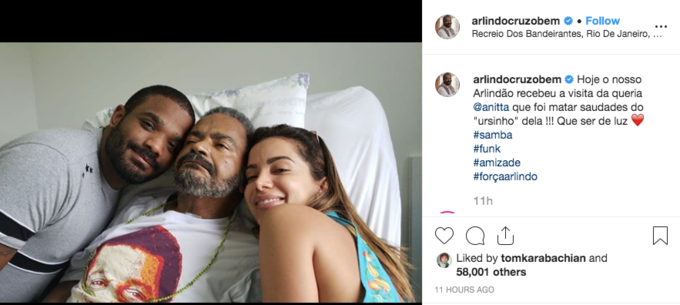 Segundo o jornal Exra, Anitta pegou carona com o filho do sambista, o Arlindinho, e aproveitou para visitar o cantor. Eles posaram juntos para uma foto.