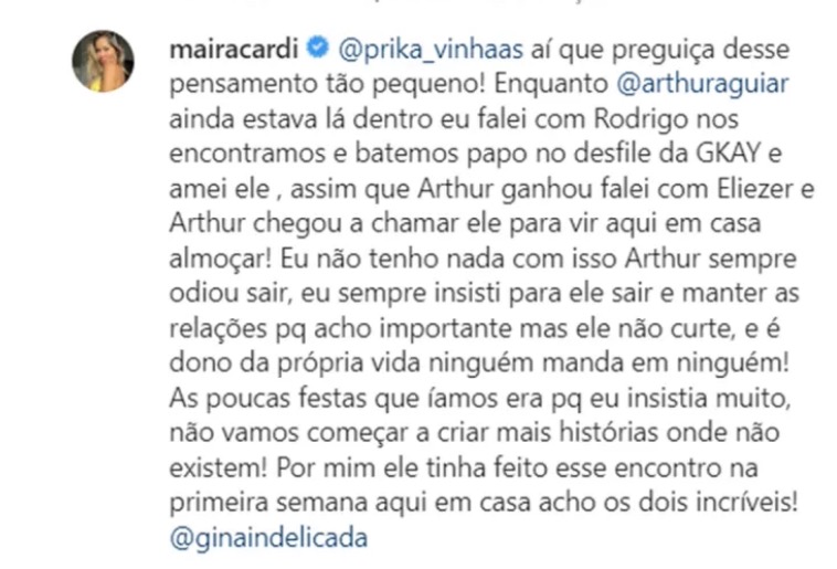 Não demorou muito e Maíra se pronunciou a respeito: “Ai, que preguiça desse pensamento tão pequeno! Enquanto Arthur ainda estava lá dentro eu falei com Rodrigo nos encontramos e batemos papo no desfile da GKkay e amei ele. Assim que Arthur ganhou falei com Eliezer e Arthur chegou a chamar ele para vir aqui em casa almoçar! Eu não tenho nada com isso. Arthur sempre odiou sair, eu sempre insisti para ele sair e manter as relações porque acho importante mas ele não curte. Ele e é dono da própria vida, ninguém manda em ninguém! As poucas festas que íamos era porque eu insistia muito, não vamos começar a criar mais histórias onde não existem! Por mim ele tinha feito esse encontro na primeira semana aqui em casa, acho os dois incríveis!”, respondeu a coach.