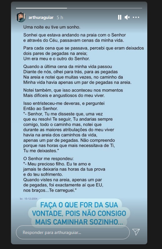 A “separação surpresa” deu o que falar e Arthur apenas compartilhou um texto religioso falando sobre Deus não abandoná-lo em momentos difíceis, com o seguinte comentário: “Faça o que for da sua vontade. Pois não consigo mais caminhar sozinho.”
