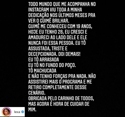 No Instagram, a cantora publicou um texto demonstrando seu choque com a situação e após passar todo o programa apoiando o marido, vai se dedicar a cuidar de si mesma diante dessa situação.