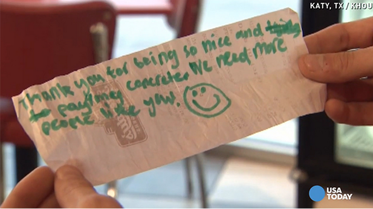 Passado cerca de meia hora, o garoto que havia sido ajudado deixou um recado de agradecimento: “Obrigado por ser tão gentil e por ter pago pela minha sobremesa. Precisamos de mais pessoas como você”. Enrolada na mensagem, estava uma nota de cem dólares.