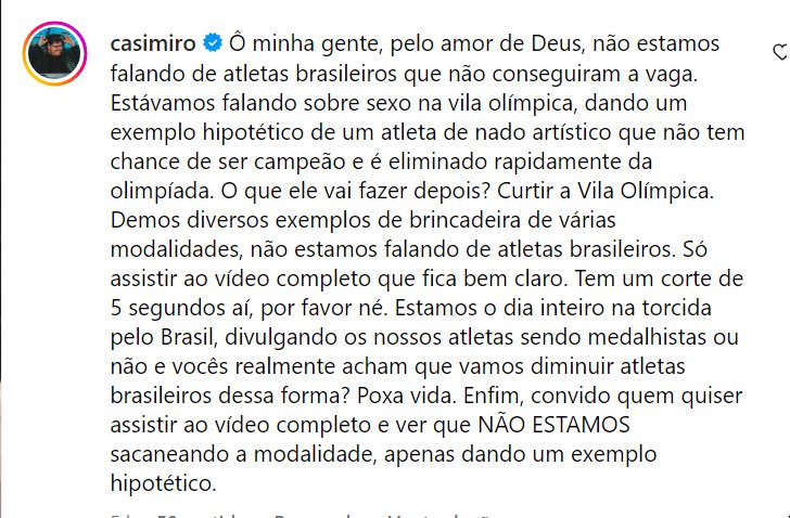 A atleta Gabi Regly, da Seleção Brasileira de nado artístico, se revoltou com Guilherme Beltrão, que comentou na CazéTV insinuando que atletas sem chance de medalha estão na Vila Olímpica para "comer gente".