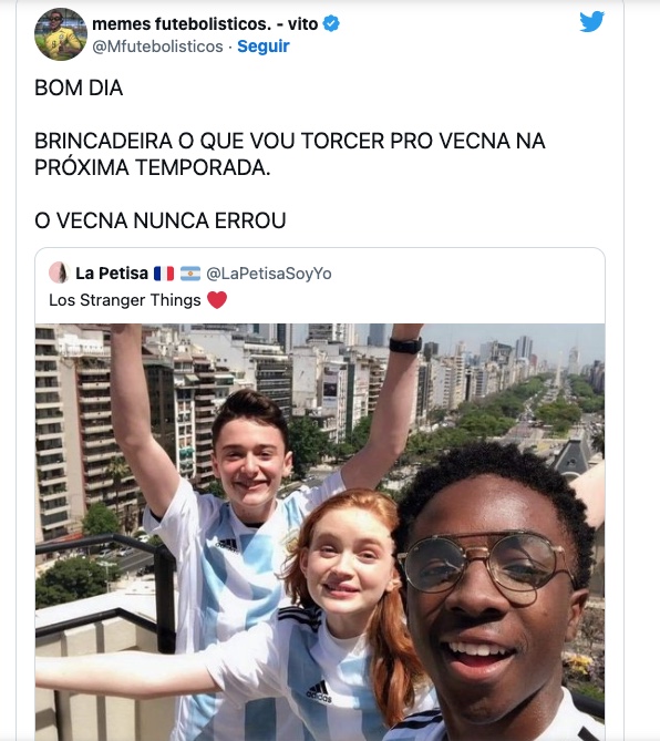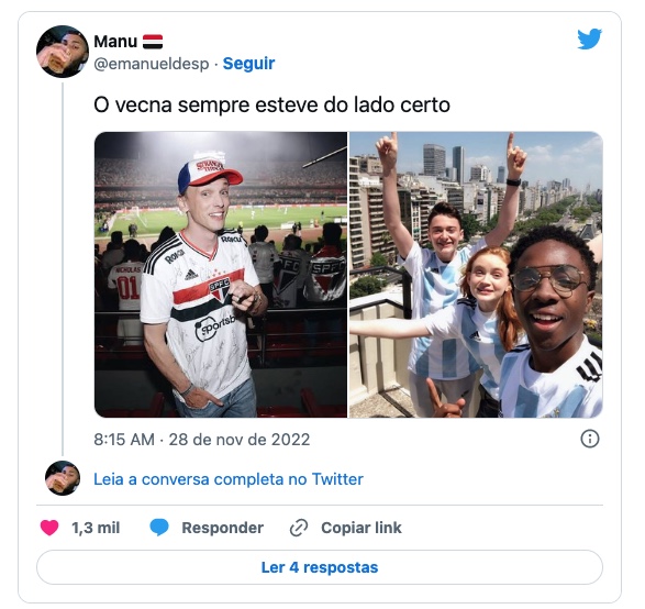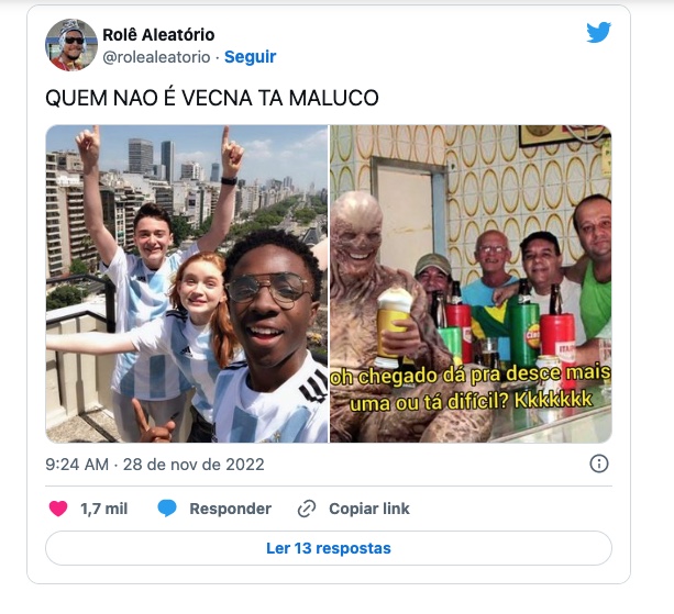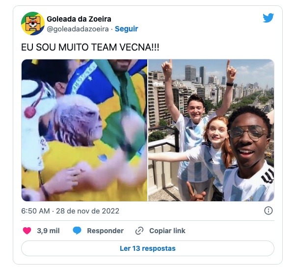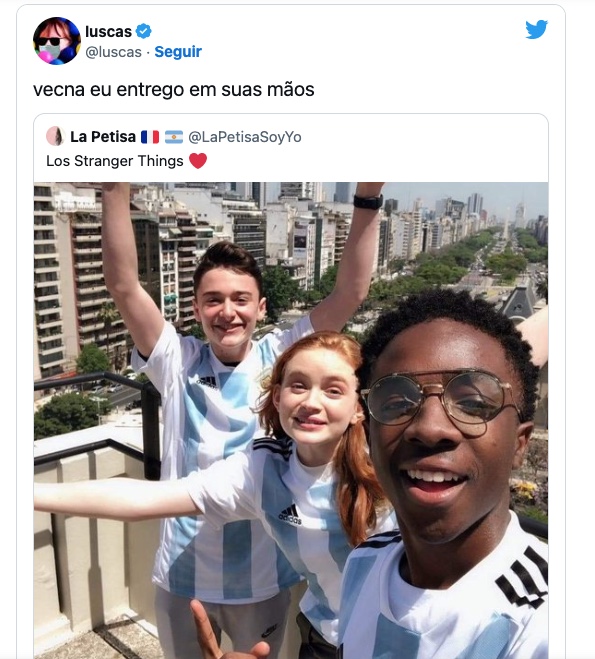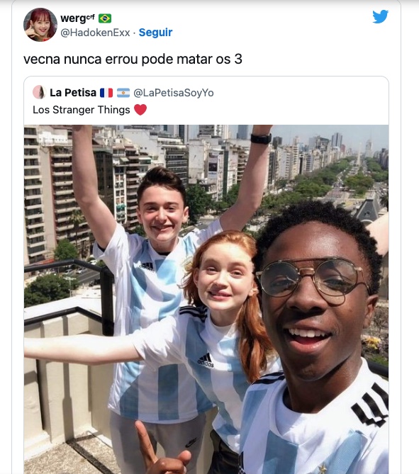Os atores da série Stranger Things, Noah Schnapp, Sadie Sink e Caleb McLaughin, divulgaram foto usando a camisa da Argentina, demonstrando torcida pelo time liderado por Lionel Messi. A foto viralizou e brasileiros passaram a ironizar os atores e afirmar que torcerão pelo vilão Vecna na próxima temporada da série.