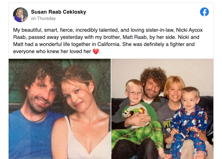 “Minha cunhada linda, inteligente, feroz, incrivelmente talentosa e amorosa, Nicki Aycox Raab, faleceu ontem com meu irmão, Matt Raab, ao seu lado. Nicki e Matt tiveram uma vida maravilhosa juntos na Califórnia. Ela era definitivamente uma lutadora e todos que a conheciam a amavam”, escreveu.