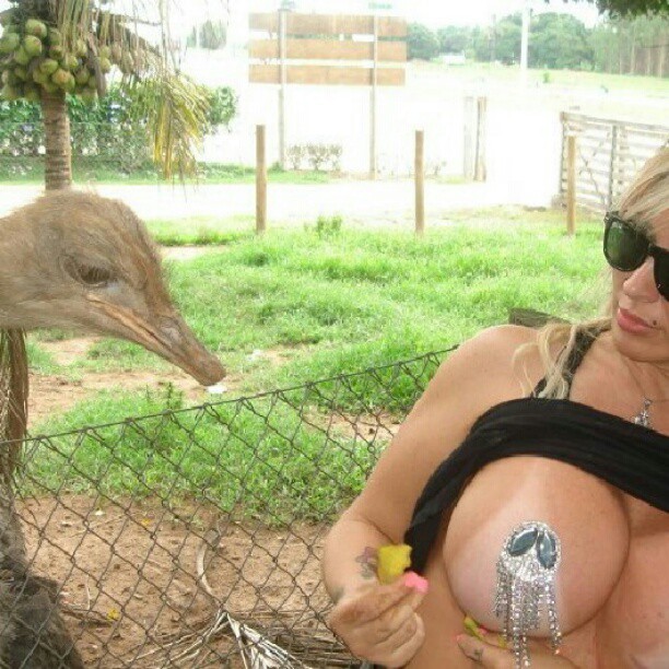 A DJ não estava satisfeita com seus velhos 2 litros em cada seio , e decidiu substituir por 3 litros em cada mama , em uma cirurgia realizada recentemente. O resultado, nós - assim como o avetruz - podemos ver na foto, tirada no zoológico e publicada na tarde desta quarta-feira (20).