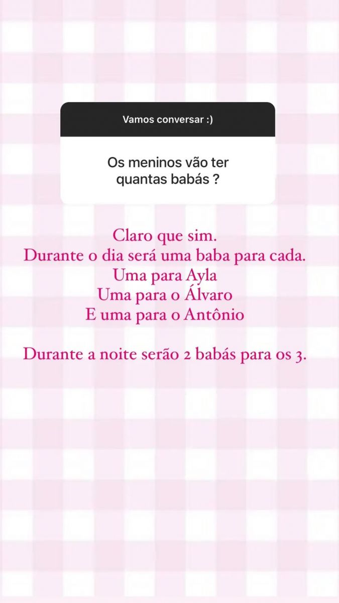 "Os meninos vão ter quantas babás?", perguntou um fã. "Durante o dia será uma babá para cada. Uma para Ayla, uma para o Álvaro e uma para o Antônio. Durante a noite serão duas babás para os três", explicou ela.