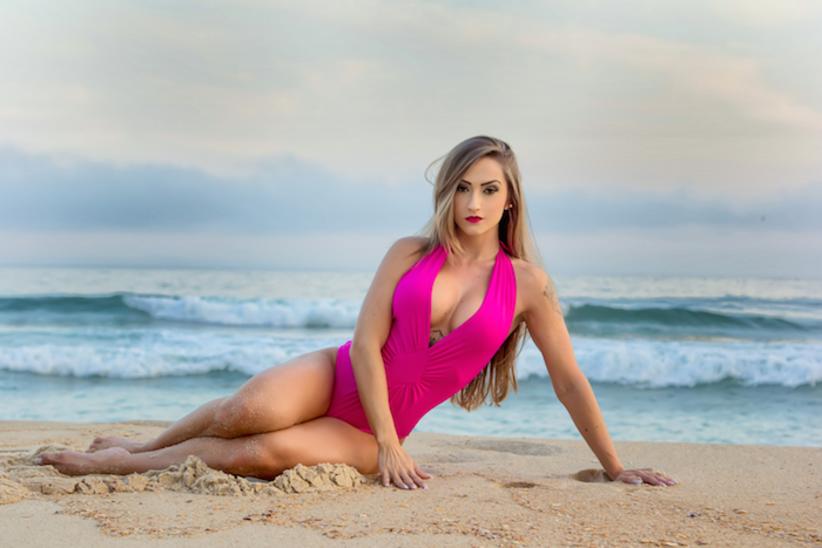 Gabriela Correa, conhecida como Barbie Fitness, posou de biquíni para um ensaio sensual na praia.