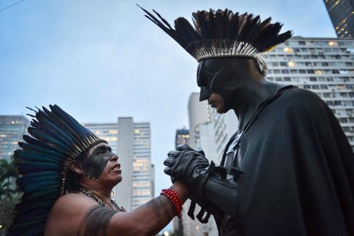 ©afp.com / Yasuyoshi Chiba - O super-herói é saudado por um índio no Centro do Rio, durante o Dia Nacional De Mobilização Indígena, em outubro de 2014