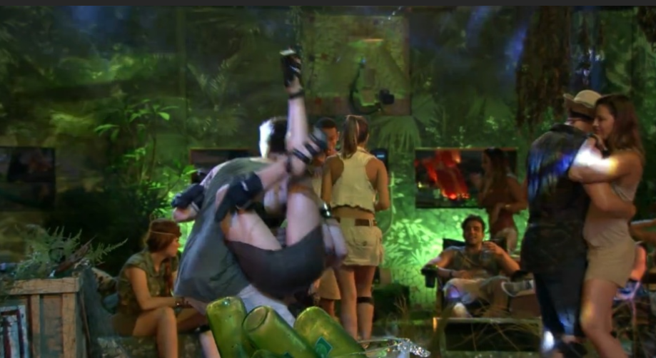 Durante festa dos perdidos do BBB na noite desta quarta-feira, Cássio levanta Aline e a sister quase mostra tudo. Reprodução/TV Globo