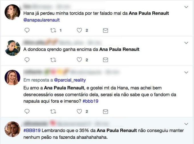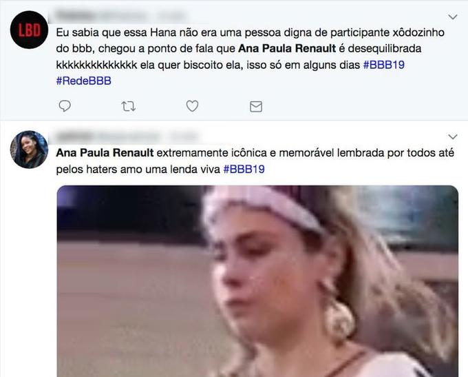 Hana disse que a Ana Paula era desequilibrada e gostava muito de briga. Os internautas do fandon de Renault não gostaram nada dos comentários, mesmo após Hana afirmar que a ex-participante podia ter chegado muito longe no reality. Confira o vídeo: