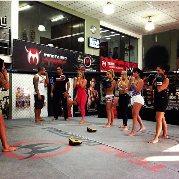 A academia Team Nogueira , dos irmãos Minotauro e Minotouro , foi invadida por um grupo de beldades nesta terça-feira, 30, para uma aula de MMA. Thaiz Schmitt , coelhinha da Playboy , publicou a foto no seu perfil no Instagram.