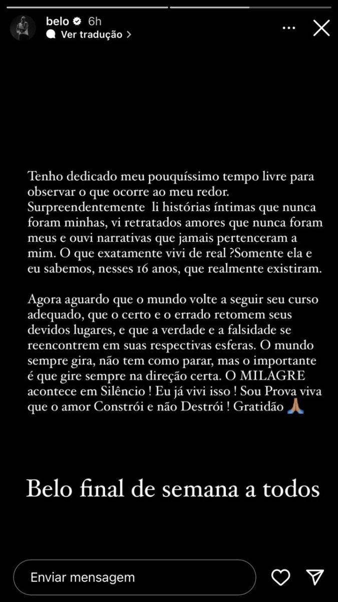 "Agora, aguardo que o mundo volte a seguir seu curso adequado, que o certo e o errado retomem seus devidos lugares, e que a verdade e a falsidade se reencontrem em suas respectivas esferas. O mundo sempre gira, não tem como parar, mas o importante é que gire sempre na direção certa. O MILAGRE acontece em silêncio! Eu já vivi isso ! Sou Prova viva que o amor Constrói e não Destrói! Gratidão. Belo final de semana a todos", desejou o artista.