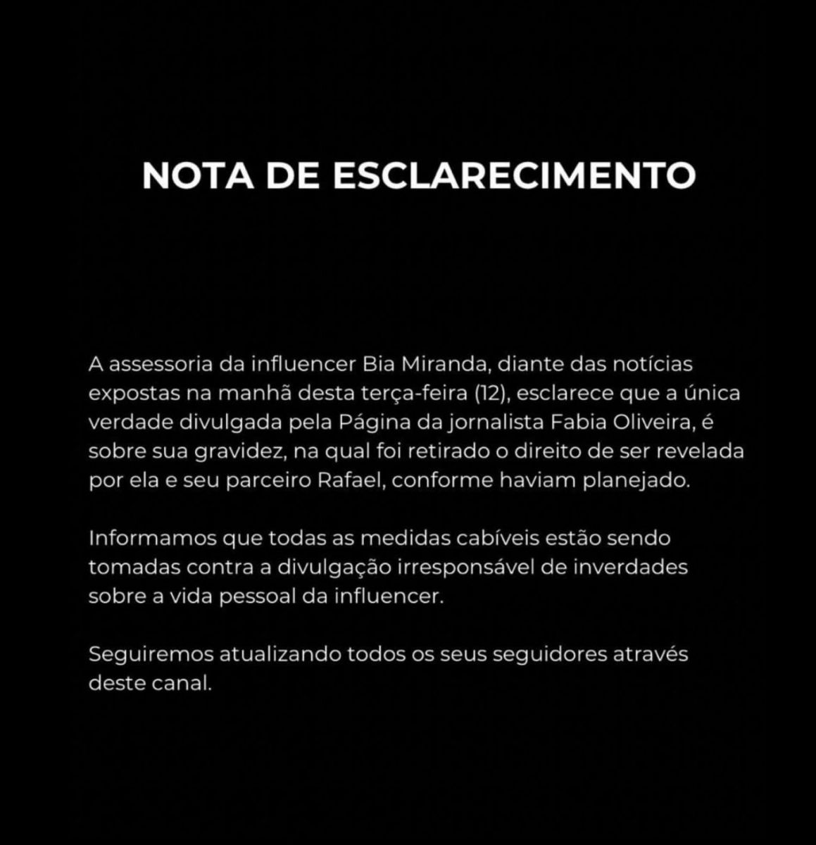 Apesar de ter afirmado que o conteúdo da conversa é inventado, a vice-campeã de A Fazenda confirmou que está grávida do atual namorado, o DJ Buarque, e lamentou ter a novidade exposta antes da hora que ela pretendia. Bia também relembrou que Gabriel tentou 'tirar' metade do seu patrimônio após a separação dos dois, alegando união estável, e afirmou que irá resolver a situação dos prints divulgados pelo ex na Justiça.