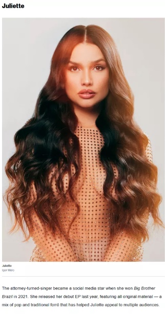 "A advogada que virou cantora se tornou uma estrela das redes sociais quando venceu o "Big Brother Brasil" em 2021. Ela lançou seu EP de estreia no último ano, que contém apenas músicas originais — uma mistura de pop e forró tradicional que ajudou Juliette a atrair diversos públicos", diz a publicação.