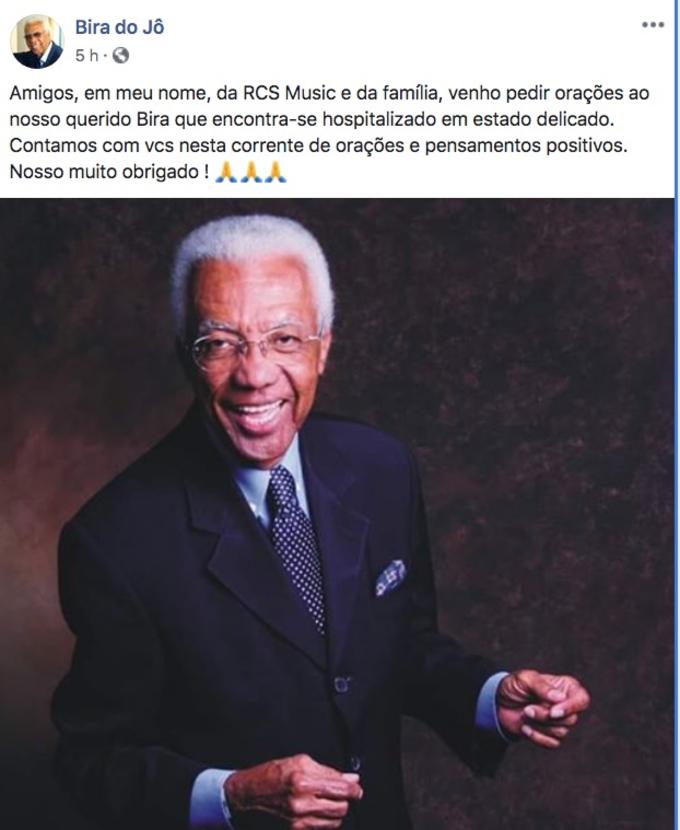 Nas páginas do músico nas redes sociais, o produtor escreveu: "Amigos, em meu nome, da RCS Music e da família, venho pedir orações ao nosso querido Bira que encontra-se hospitalizado em estado delicado. Contamos com vcs nesta corrente de orações e pensamentos positivos. Nosso muito obrigado!".