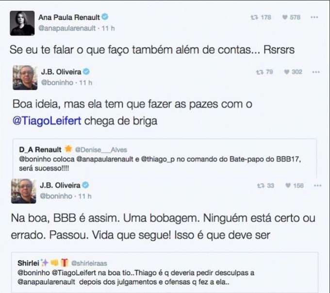 Depois disso, uma internauta se manifestou dizendo que ama o Tiago e Boninho alertou: “Lu fica quieta as Renolt odeiam ele vão te massacrar kkkkk”.