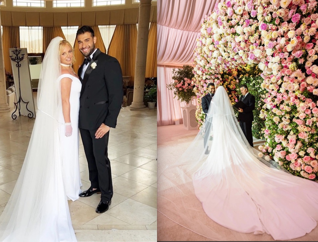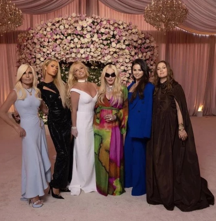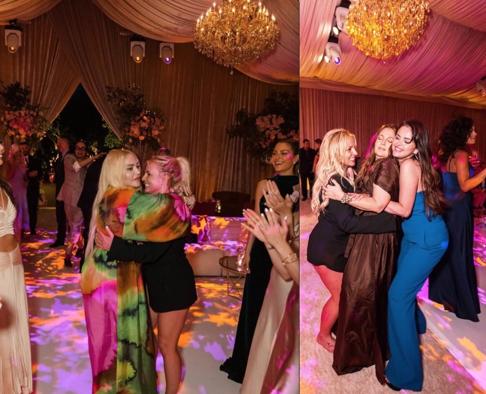 Foram divulgadas imagens do casamento de Britney Spears com Sam Asghari, que aconteceu na quinta-feira (9) na mansão da cantora em Los Angeles. Em um dos cliques, Brit aparece ao lado de ninguém menos que Madonna, Selena Gomez, Drew Barrymore, Paris Hilton e a estilista Donatela Versace.