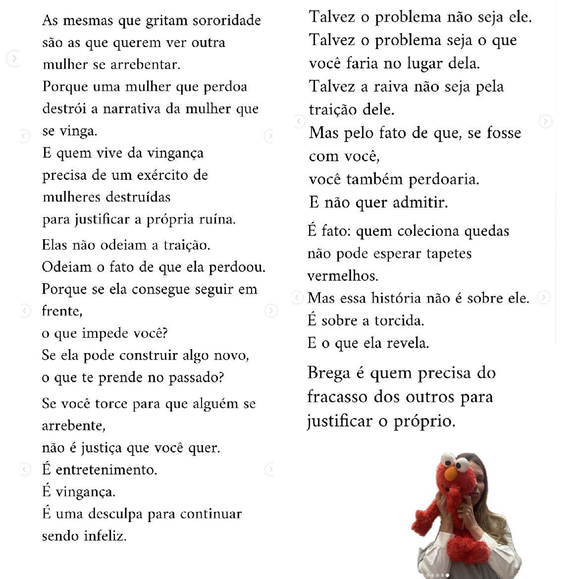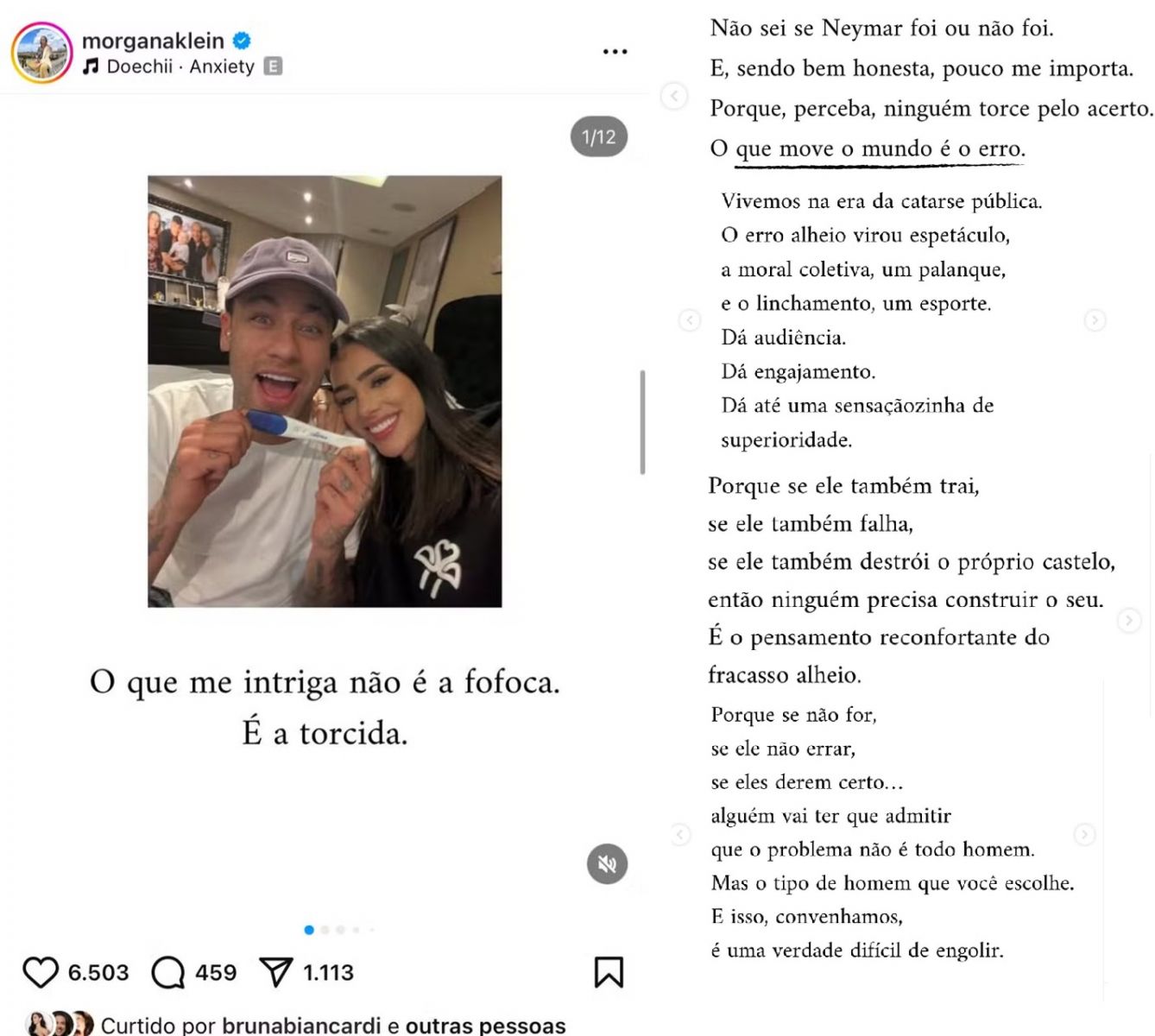 Críticas - Nos comentários, o post curtido por Bruna foi criticado por "romantizar a traição" e tentar "fazer poema para corno". "Falou, falou, falou e colocou a culpa na mulher. E no texto fala de sororidade. O caso do Neymar é a prova da normalização de qualquer grande merd@ que os homens façam. Tá tudo bem, porque temos as mulheres para culpar...", escreveu uma internauta. "Quanto malabarismo pra romantizar traição", disse outra. "Brega é vc MULHER, fazer um texto desse , para tirar o erro do cara das costa dele e colocar no povo que já sabia que aconteceria . Ninguém tava torcendo, tava rindo pq já sabe quem ele é e que ela aceita", comentou mais uma.