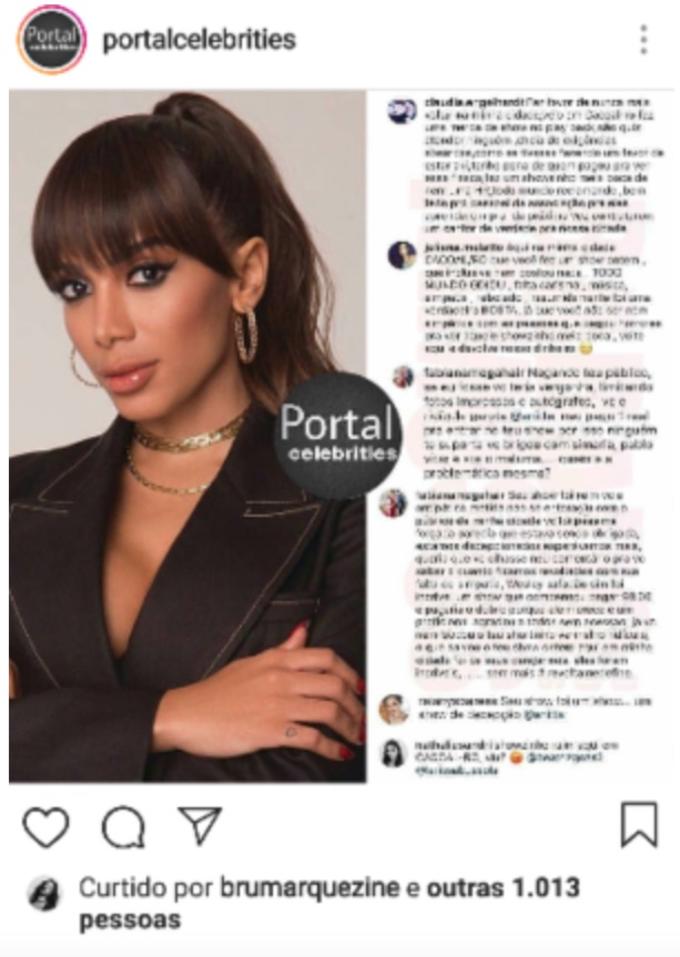 Anitta foi alvo de duras críticas feitas por um perfil no Instagram que se referiu a um show em Rondônia, no qual teria cantando poucas músicas e estaria pouco animada.