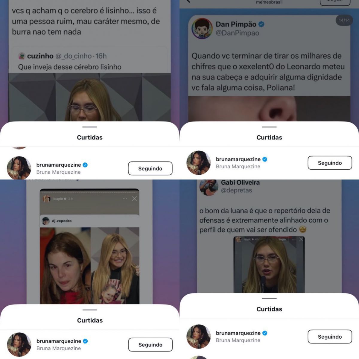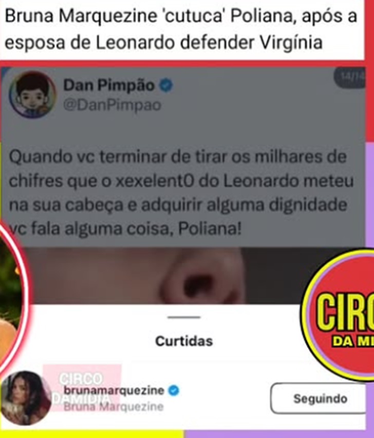 Além disso, Bruna também curtiu um tuíte que elogiava a postura da atriz Luana Piovani e alfinetava Poliana Rocha, esposa do cantor Leonardo, pai de João Guilherme, ex-namorado de Marquezine. "Quando você terminar de tirar os milhares de chifres que o xexelento do Leonardo meteu na sua cabeça e adquirir alguma dignidade, você fala alguma coisa, Poliana!", dizia o post.