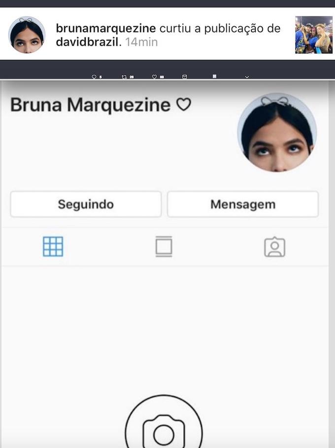 Vale ressaltar que Bruna estava stalkeando David já que ela não o segue no Instagram. Prova disso, é que ela descurtiu o post e logo depois deixou de seguir Anitta na redes social. Depois, Marquezine voltou a seguir a cantora e desativou seu perfil.
