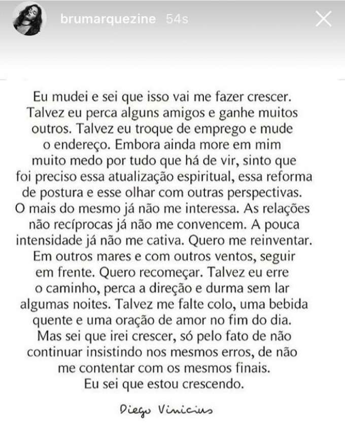 “Quero me reinventar. Em outros mares e com outros ventos, seguir em frente. Quero recomeçar. Talvez eu erre o caminho, perca a direção e durma sem lar algumas noites. Talvez me falte colo, uma bebida quente e uma oração de amor no fim do dia. Mas sei que irei crescer, só pelo fato de não continuar insistindo nos mesmos erros, de não me contentar com os mesmos finais. Eu sei que estou crescendo”, diz um trecho da mensagem.