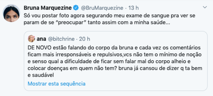 Bruna Marquezine se pronunciou, nesta domingo (23), sobre as críticas que recebeu a respeito do seu corpo. No twitter, a atriz de 24 anos respondeu um internauta que a defendeu.