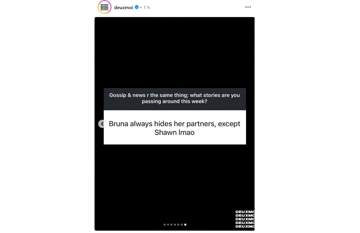 No carrossel de imagens, o Deux Moi mostrou que recebeu uma mensagem em inglês de um seguidor dizendo: "Bruna sempre esconde seus parceiros, exceto por Shawn [risos]". A observação foi interpretada como uma indicação de que Bruna não teria feito esforço para manter o suposto affair com o cantor canadense longe dos holofotes.