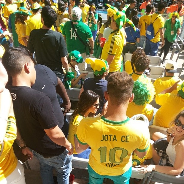 A atriz fez sucesso na arquibancada e posou para fotos com vários fãs, enquanto vibrava pelo craque e pela seleção Brasileira.
