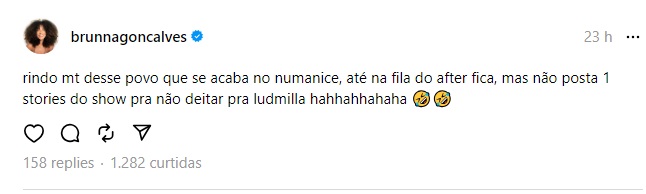 "Rindo muito desse povo que se acaba no Numanice, até na fila do after fica, mas não posta 1 stories do show para não deitar para Ludmilla hahahahahaha", escreveu ela no.