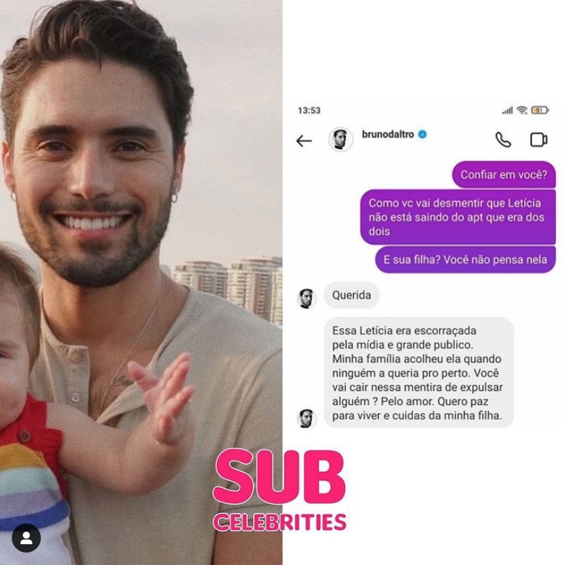 Bruno, então, respondeu: “Querida, essa Letícia era escorraçada pela mídia e grande público. Minha família acolheu ela quando ninguém a queria por perto. Você vai cair nessa mentira de expulsar alguém? Pelo amor. Quero paz para viver e cuidar da minha filha”, disse.