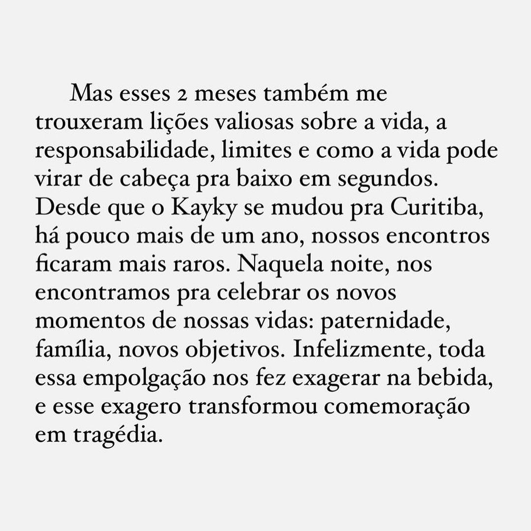 "Desde que o Kayky se mudou pra Curitiba, há pouco mais de um ano, nossos encontros ficaram mais raros. Naquela noite, nos encontramos pra celebrar os novos momentos de nossas vidas: paternidade, família, novos objetivos. Infelizmente, toda essa empolgação nos fez exagerar na bebida, e esse exagero transformou comemoração em tragédia."