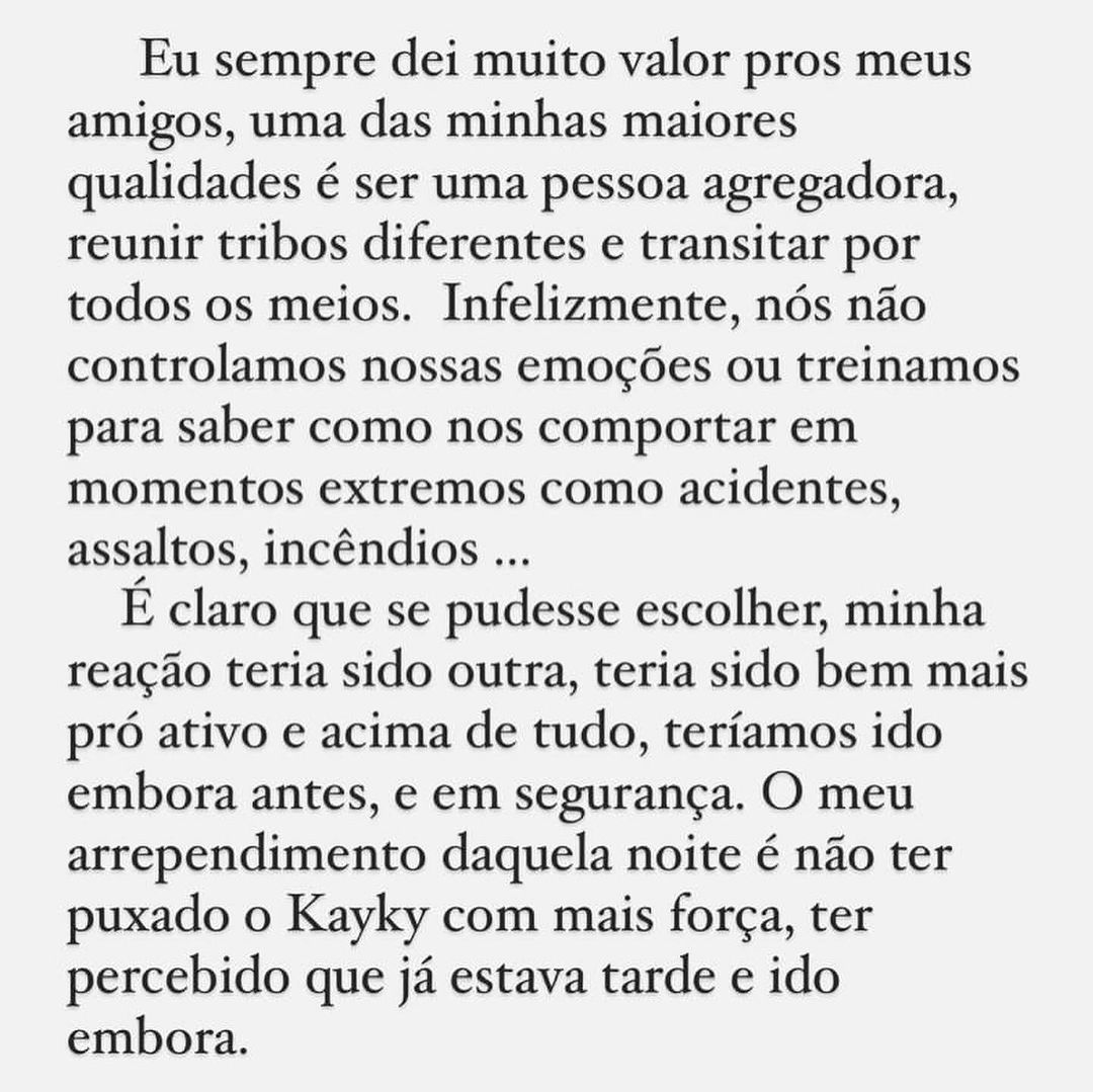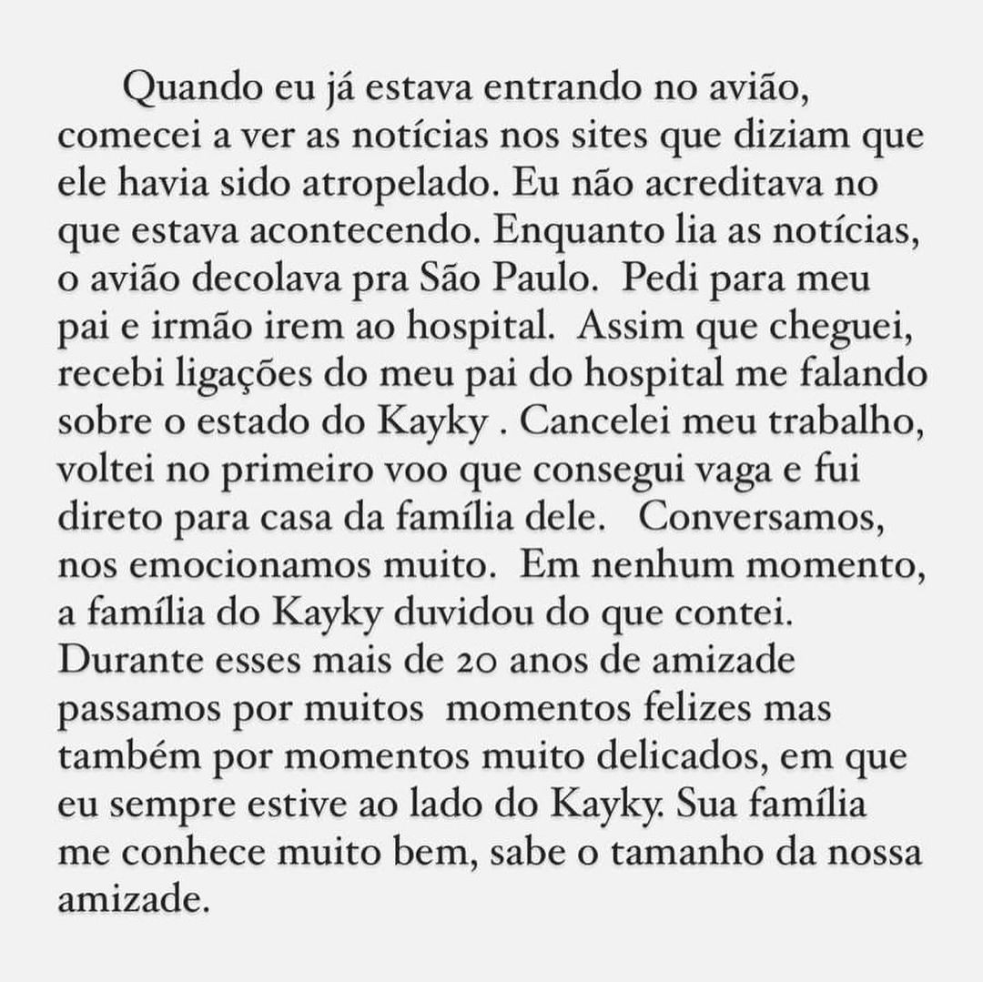 "Durante esses mais de 20 anos de amizade passamos por muitos momentos felizes, mas também por momentos muito delicados, em que eu sempre estive ao lado do Kayky. Sua família me conhece muito bem, sabe o tamanho da nossa amizade."
