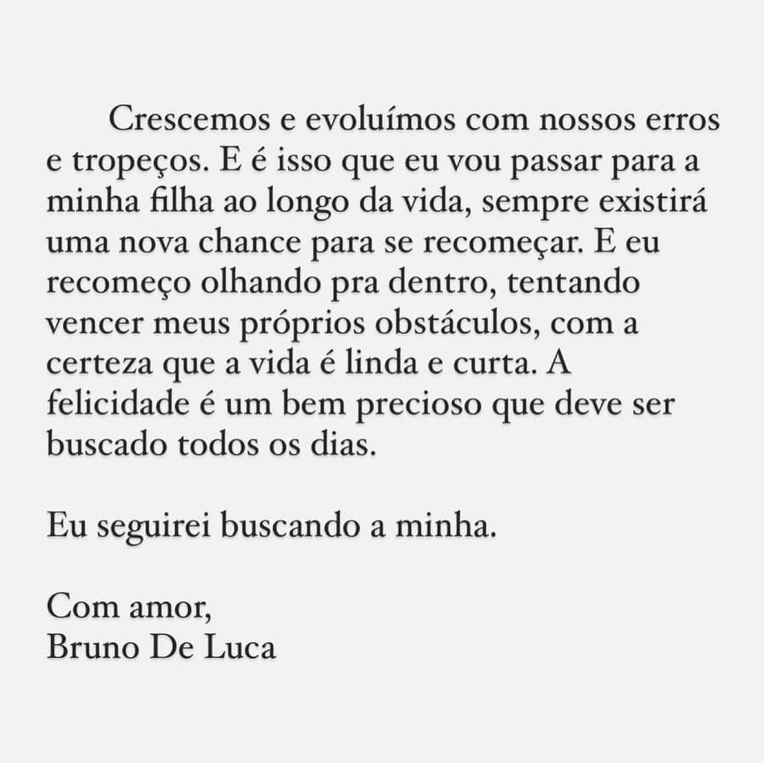 "Crescemos e evoluímos com nossos erros e tropeços. E é isso que eu vou passar para a minha filha ao longo da vida, sempre existirá uma nova chance para se recomeçar. E eu recomeço olhando pra dentro, tentando vencer meus próprios obstáculos, com a certeza que a vida é linda e curta. A felicidade é um bem precioso que deve ser buscado todos os dias. Eu seguirei buscando a minha".
