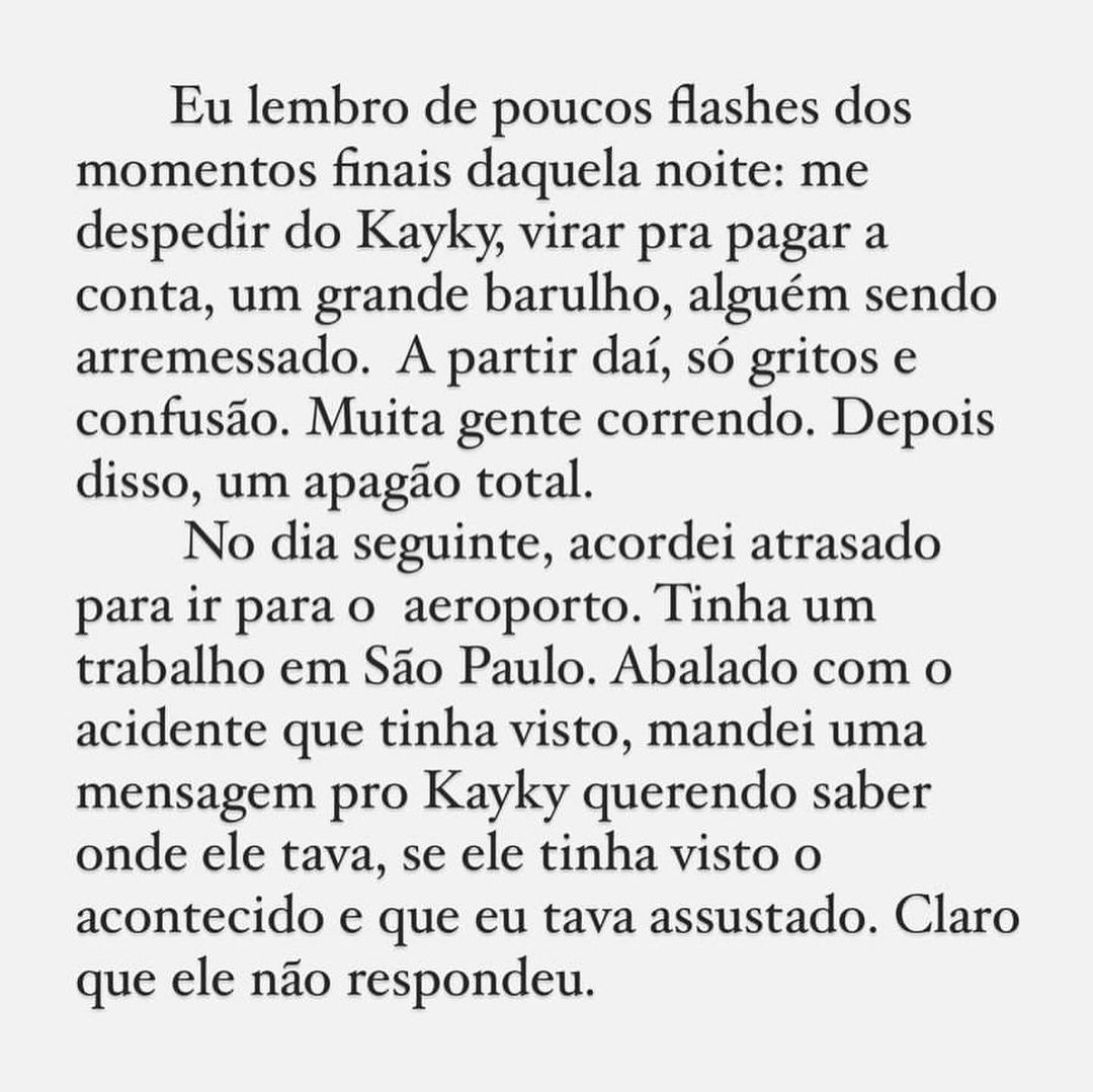 "No dia seguinte, acordei atrasado para ir para o aeroporto. Tinha um trabalho em São Paulo. Abalado com o acidente que tinha visto, mandei uma mensagem pro Kayky querendo saber onde ele tava, se ele tinha visto o acontecido e que eu estava assustado. Claro que ele não respondeu".