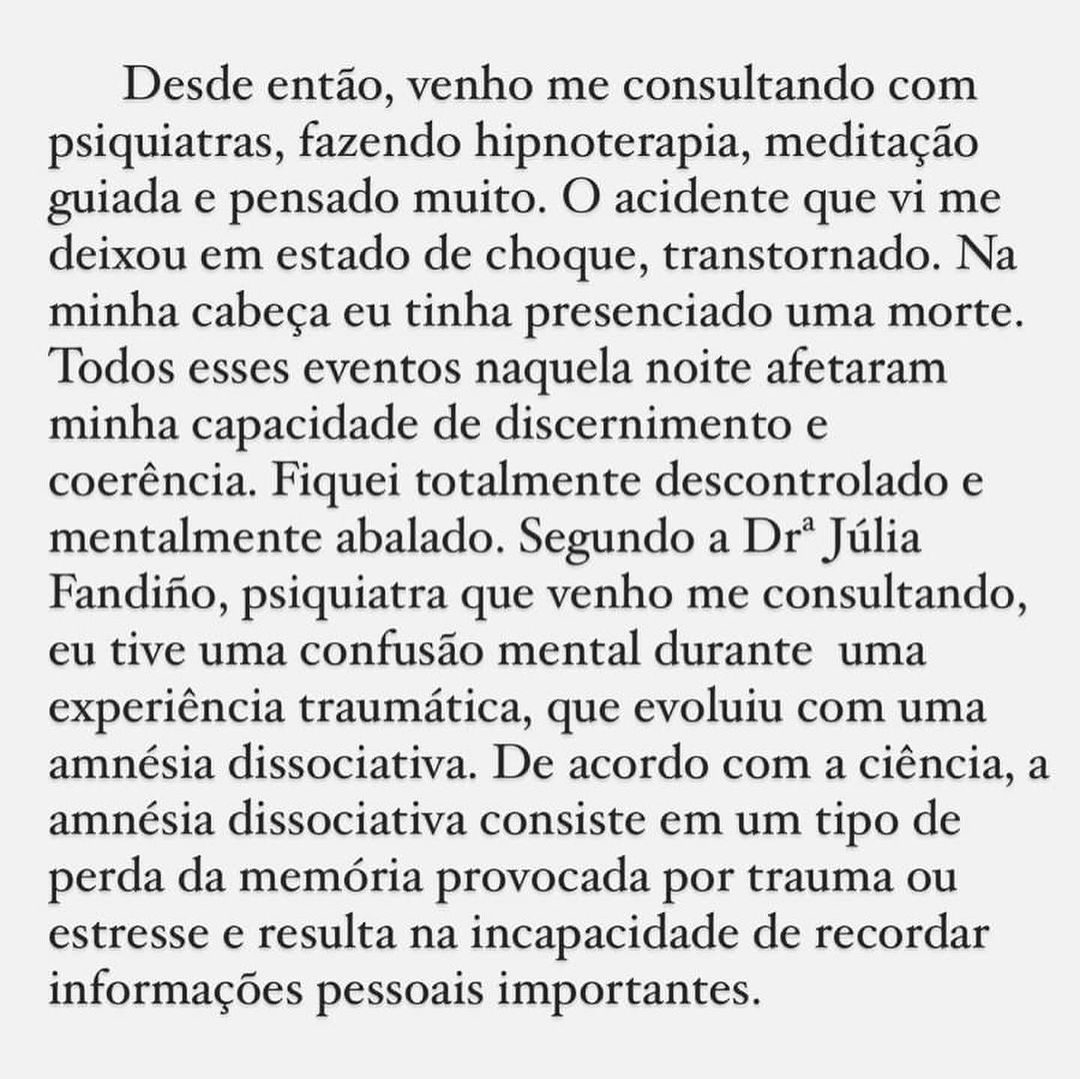 : "Desde então, venho me consultando com psiquiatras, fazendo hipnoterapia, meditação guiada e pensado muito. O acidente que vi me deixou em estado de choque, transtornado. Na minha cabeça eu tinha presenciado uma morte. Todos esses eventos naquela noite afetaram minha capacidade de discernimento e coerência. Fiquei totalmente descontrolado e mentalmente abalado".