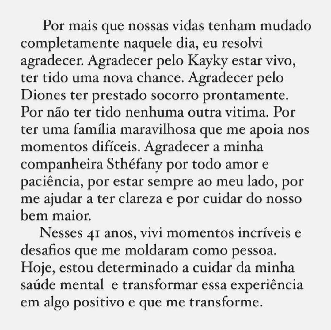 "Por mais que nossas vidas tenham mudado completamente naquele dia, eu resolvi agradecer. Agradecer pelo Kayky estar vivo, ter tido uma nova chance. Agradecer pelo Diones ter prestado socorro prontamente. Por não ter tido nenhuma outra vítima. Por ter uma família maravilhosa que me apoia nos momentos difíceis. Agradecer a minha companheira Sthéfany por todo amor e paciência, por estar sempre ao meu lado, por me ajudar a ter clareza e por cuidar do nosso bem maior".